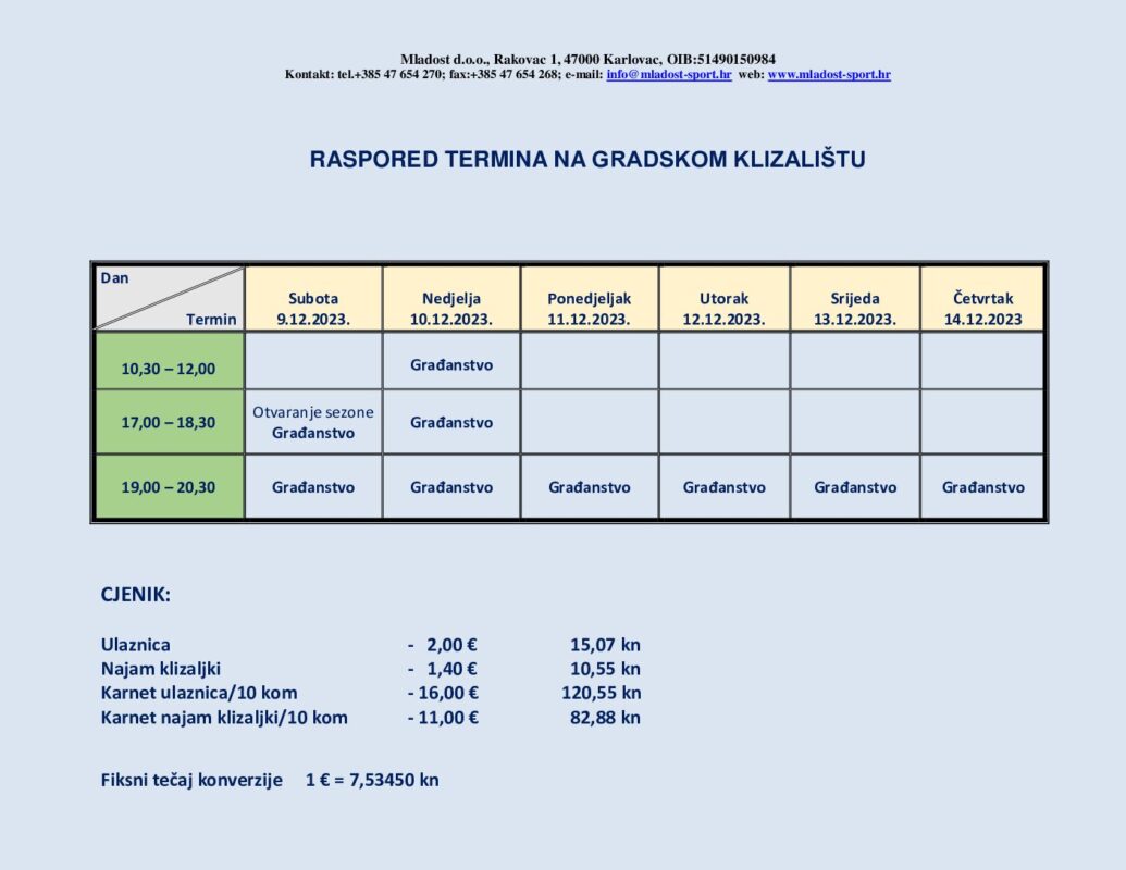 Klizati se može od ponedjeljka do petka od 19:00 do 20:30, a